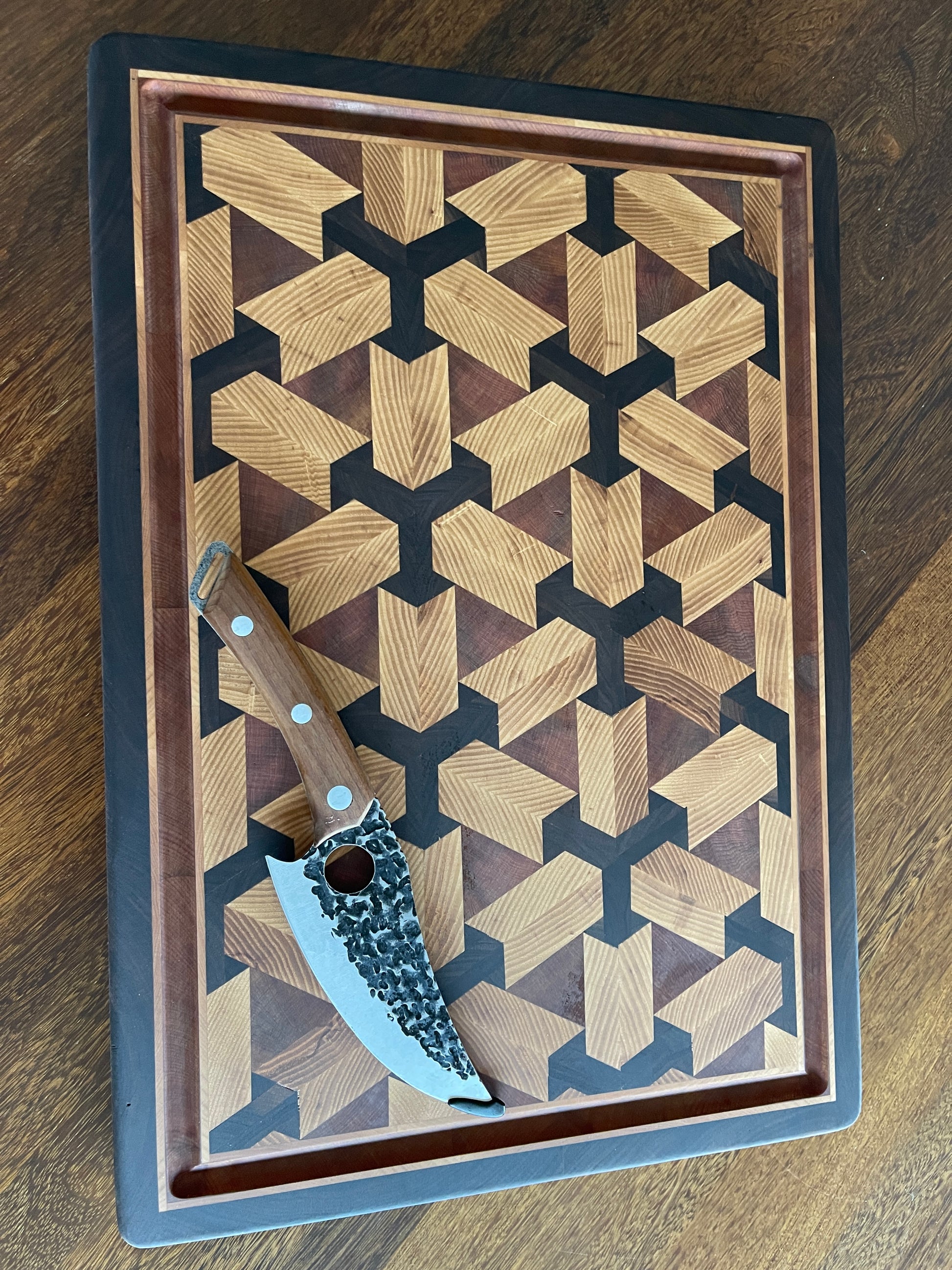 This 3D Scaffold design is a luxury end-grain chopping board, meticulously handcrafted for those who appreciate design as much as function. Its striking geometric pattern creates a striking three-dimensional illusion - an architectural rhythm that feels both modern and timeless.