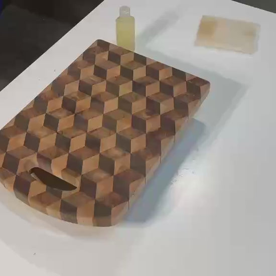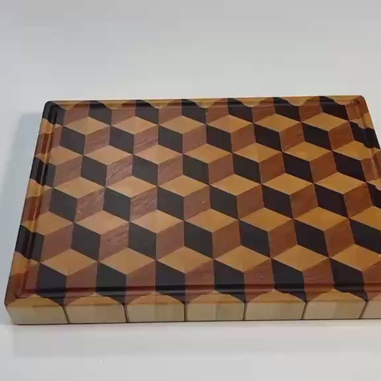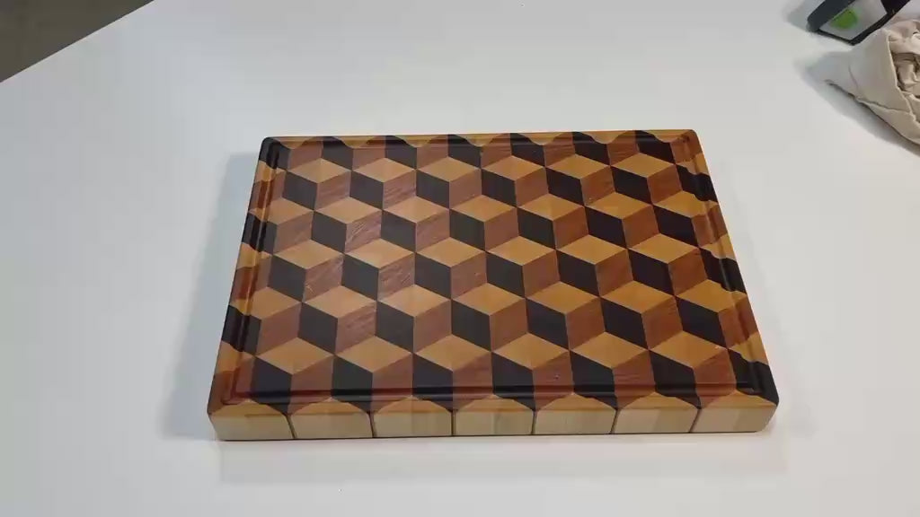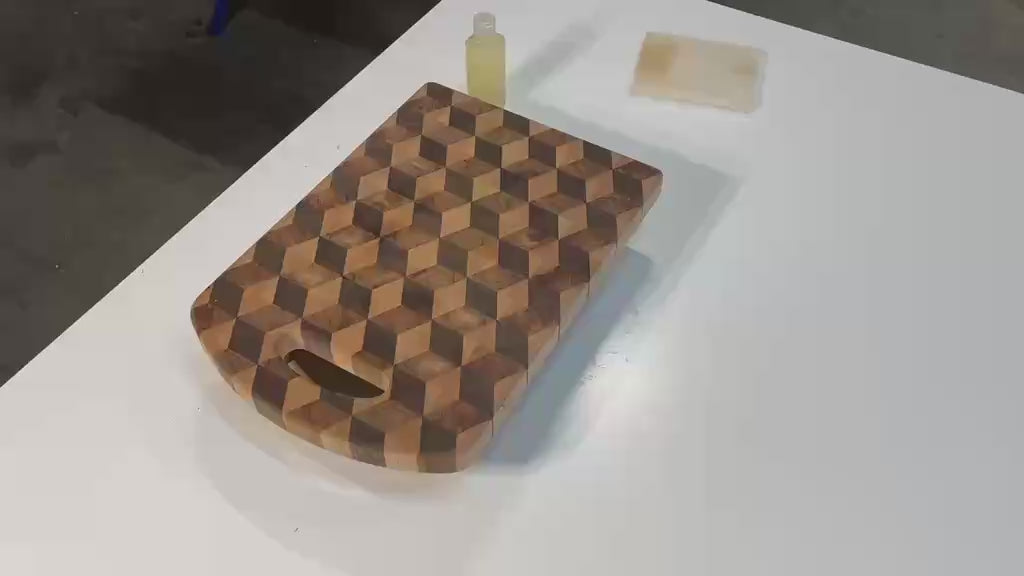 Elevate your kitchen with these handcrafted 3D end-grain chopping boards, designed to not only provide a perfect platform to chop and carve up for favorite roast but also as a statement piece for your benchtop. Each board is meticulously crafted with premium hardwoods, Walnut, Maple and Cherry, creating a striking 3D cube illusion that blends artistry with practicality and durability.